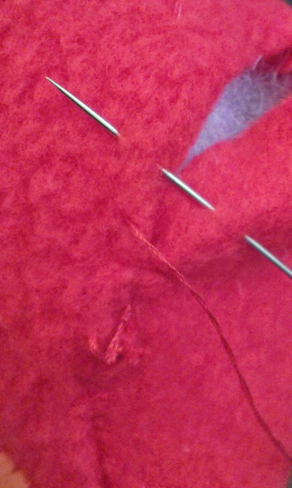 As I have mentioned before, in my towel hoodie tutorial, with large projects I prefer to roll up the project for easier maneuvering. Then I feed the project into the sewing machine slowly, with my right hand guiding the un-sewed portion in front of the sewing machine, and my left hand guiding the already-sewed portion from behind the machine. I sew slowly, and adjust the fabric very couple inches. In this way, the weight of the project does not pull my stitches all over the place.